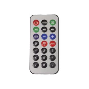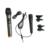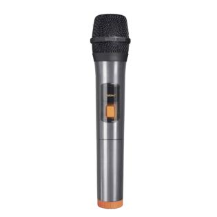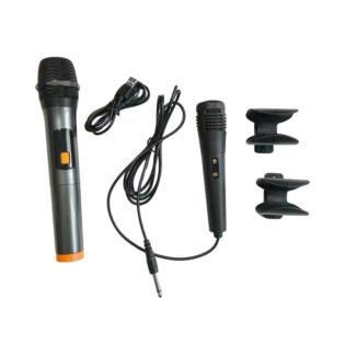 The lighting can also be turned off. The package includes a remote control, a wired microphone, and a wireless microphone.