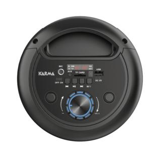 Dual woofer amplified speaker, designed both for listening to music and for enjoying Karaoke in company. The look is extremely original and features exclusive details, such as the coloured grid and the lighting of the woofers that creates a joyful atmosphere. Ideal to listen to music from your smartphone via bluetooth and easy to carry thanks to its little weight  It is powered by a 2400mAh lithium battery that guarantees hours of operation. It is supplied with a practical remote control and a wired microphone, ready for use.  It can be recharged via USB (cable included).