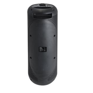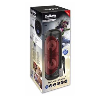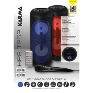 Dual woofer amplified speaker, designed both for listening to music and for enjoying Karaoke in company. The look is extremely original and features exclusive details, such as the coloured grid and the lighting of the woofers that creates a joyful atmosphere. Ideal to listen to music from your smartphone via bluetooth and easy to carry thanks to its little weight  It is powered by a 2400mAh lithium battery that guarantees hours of operation. It is supplied with a practical remote control and a wired microphone, ready for use.  It can be recharged via USB (cable included).