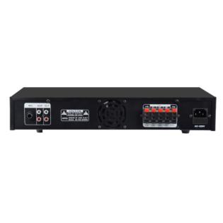 Its total power of 240W can be either used at will on the 3 zones or be available in the 8-16 Ohm output. The zones are endowed with independent volume. It features 2 mic inputs (the first one with priority function), 1 line input and 1 line output. The built-in MP3 player can play songs from USB sticks and has its own independent volume. It also includes a Bluetooth receiver.