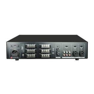 One of the most evolved PA amplifiers on the market.  It can manage 6 matrix zones and it can receive an input signal and send it independently to one of the 6 outputs.  Each zone is endowed with a separate volume and keys for immediate exclusion.  It includes a MP3 module with display, radio am/fm and USB/SD sockets. Priority function on the microphone and headphone connector with adjustable volume.