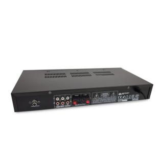 Stereo amplifier with wide display showing main information on the current track. It comes with 2 microphone inputs and it offers the possibility to play USB/SD or bluetooth audio. It also features headphone and monitor socket to connect an external amplifier.