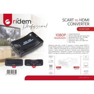 Audio-video adapter useful to convert an old SCART signal to HDMI format, compatible with the current TVs. It features a selector for 720P or 1080P resolution and it can be powered from and ordinary USB socket, thanks to the included cable. Thanks to this accessory it is possible to use old fixtures, such as videorecorders, cameras or decoders endowed only with SCART sockets, which would not be compatible with the current monitors or TV screens.