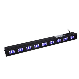 UV blacklight bar with 9 x 3W leds. Thanks to its particular effect the white colour will apper particularly brightt. Ideal for dancing evenings, but also for architectural coreographies.  It is often used also for industrial appliances. Thanks to the two small brackets on the sides it can be wall mounted and it is possible to adjust the inclination as needed. The power cable includes a schuko socket and it is endowed with on/off switch.