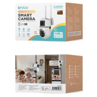 Sistema di sorveglianza con doppia videocamera e attacco a parete. Nella confezione sono presenti sia un cavo USB per l'alimentazione sia le viti e i tasselli necessari all'installazione. La videocamera dispone di una inquadratura fissa e di una motorizzata in grado di riprendere a 355° con rotazione verticale di 150°
