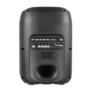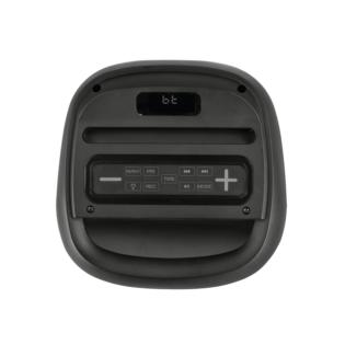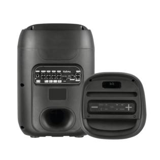 Party box con woofer da 8" per un suono pulito e potente in una dimensione contenuta. Offre un'ottima autonomia grazie alla batteria ricaricabile da 3600mA. Frontalmente presenta un display mentre i comandi e le prese sono sulla parte superiore. Oltre a lettere brani MP3 da chiavette e schedine, è in grado di collegarsi tramite bluetooth a smartphone e tablet. Registra su USB e offre funzione eco sul microfono. Si ricarica tramite comune cavo USB TipoC. Include un radiomicrofono e un telecomando per il controllo a distanza.