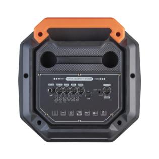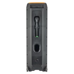 Party box con triplo woofer da 8" per una resa acustica unica. La parte frontale è illuminata in con vari effetti ma i led possono anche essere spenti. Il pannello di comando frontale offre tutte le regolazioni (toni alti, bassi, eco..). Incorpora un lettore Mp3 tramite microSD e USB. La ricevente bluetooth si collega allo smartphone per la riproduzione della propria musica. In confezione sono presenti un telecomando ad infrarossi e un pratico radiomicrofono.