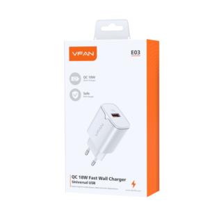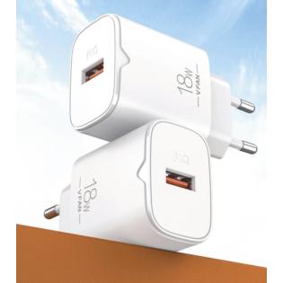 Caricatore da 18W con presa USB. Supporta lo standard di ricarica rapida Quick Charge 3.0 e dispone di specifici circuiti che lo proteggono da sovraccarichi e surriscaldamenti. Può gestire ricariche con le seguenti tensioni: 5V-3A / 9V-2A/ 12V -1,5A
