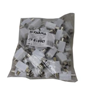 Sdoppiatore per cavi di antenna con 1 connettori maschio e 2 connettore femmina. Acquistabile esclusivamente in confezione industriale da 50pz.