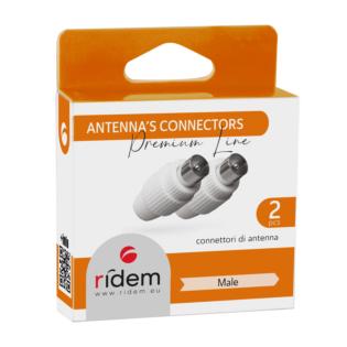 Coppia di connettori maschi adatti al collegamento di cavo d'antenna. Realizzati in colore bianco, si montano facilmente e una volta applicati risultano robusti e resistenti agli strappi.