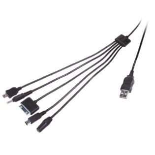 Cavo multifunzione con spina USB e 7 differenti adattatori idonei per NDSi, ipod/Iphone, PSP, Mini USB, micro USB, Nokia e Presa USB. Con un unico cavo potrete ricaricare i vostri apparecchi tramite computers o tramite qualsiasi presa USB.