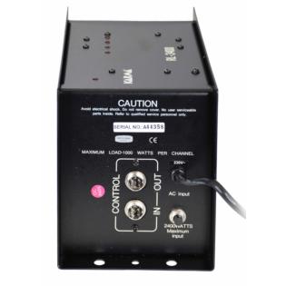 Si tratta di un particolare apparecchio studiato per l’accensione/spegnimento di effetti luce e -Chase-. Un circuito permette l’accensione -soft- delle apparecchiature connesse eliminando ogni tipo di spuria che potrebbe danneggiarle. E’ indicato per ogni tipo di carico induttivo quali neon, pinspots, motori, etc. Il carico massimo per ogni canale è di 600W per un totale di 2400W. Utilizzabile in abbinamento al controller Karma CL 2400 e SC 1230.