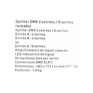 Possiede prese tripolari XLR per 2 segnali DMX in ingresso e 4/8 segnali in uscita. Incorpora un amplificatore di segnale per la massima resa.