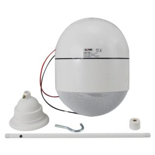 Diffusore con trasformatore per impianti 100V. Applicabile a soffitto. Ha un'estensione massima di 65cm con il gancio (58cm senza)
