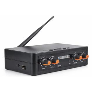 E' composto da 2 diffusori amplificati con regolazione di volume indipendente e da una centralina trasmittente con funzione radio, Mp3, bluetooth e presa microfonica. Basta collegare i diffusori ad una comune presa elettrica per ricevere il segnale dalla trasmittente in un raggio di 20mt.