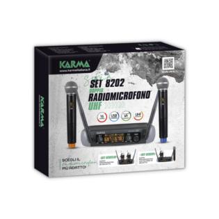 Doppio radiomicrofono ad archetto operante in banda UHF. Sia i microfoni che la base ricevente sono provvisti di display per il controllo della frequenza operativa e del livello di carica della batteria.