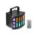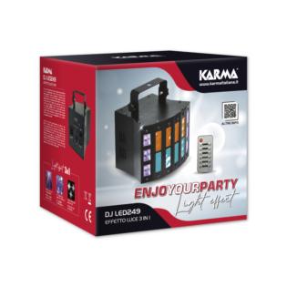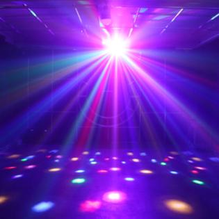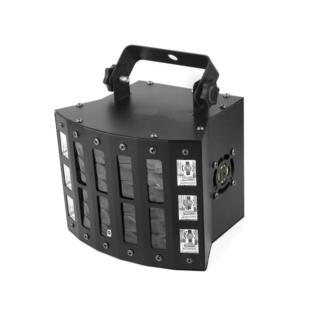 Straordinario illuminatore per feste composto da ben 3 effetti in un unico apparecchio. L'effetto derby occupa le 8 finestre frontali e genera numerosi raggi luminosi in movimento grazie ai 9 led da 3W. Le 6 finestrelle poste sugli esterni svolgono una doppia funzione: effetto stroboscopico e effetto wood. I 6 led in esse contenute sono in fatti in grado di generare luce UV (che fa riflettere qualsiasi oggetto o vestito bianco) e effetto strobo con lampeggio regolabile. Grazie al telecomando potrete pilotare le principali funzioni ma l'apparecchio è in grado di operare anche in completa autonomia, in automatico, a tempo di musica ma può essere anche collegato ad un impianto professionale di tipo DMX.