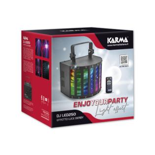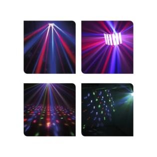 Effetto luce motorizzato in grado di proiettare una moltitudine di raggi colorati che, incociandosi generano un'atmosfera suggestiva. Ideale per feste, utilizza 9 led da 3W ed è in grado di operare in modalità automatica, a tempo di musica o in DMX grazie all'interfaccia di cui dispone. Il display permette di regolare facilmente ogni parametro. Il telecomando in dotazione controlla a distanza le principali funzioni.