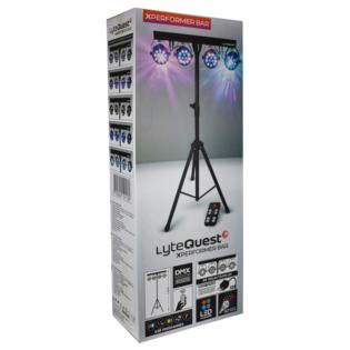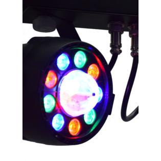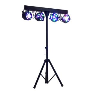 Un Kit composto da un supporto a treppiede, una barra con interfaccia DMX e 4 fari , di cui 2 con effetto luce rotante. In totale i led sono ben 42 con una potenza di 3W ciascuno. Si monta e smonta in pochi secondi. Grazie al telecomando è possibile controllare l'accensione dei led a distanza. Adatto a musicisti ma anche per realizzare piccole feste.