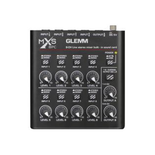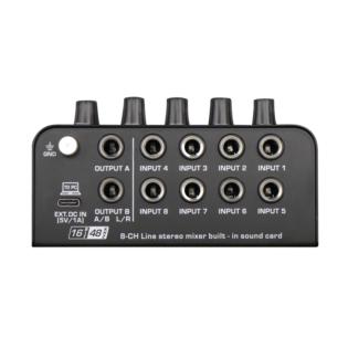 Compatto e completo, questo piccolo mixer può gestire 8 segnali mono o stereo disponibili tramite connettori 6,3mm. Ogni segnale ha a disposizione un comando di volume indipendente e un tasto per specificare se il suono del canale è mono o stereo. Anche le uscite sono disponibili su prese 6,3mm. Due comandi master regolano il volume rispettivamente dei canali 1-4 e 5-8 ma all'occorrenza, tramite un tasto verranno miscelati tutti i canali, saranno controllati da un unico comando volume e disponibili su unica presa 6,3mm.