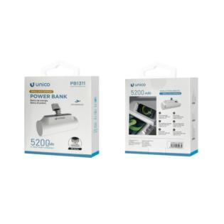 Power bank da 5200mA con presa lightning per telefini Apple. Con una capacità di carica di 2,1A e un peso e dimensioni ridotte, può essere facilmente tenuto in borsa, in auto ed è immediatamente pronto all'uso. Si inserisce direttamente nel telefono e grazie ad un sostegno estraibile può mantenere il telefono sollevato orizzontalmente consentendo la visione di film o attivando la modalità "comodino".