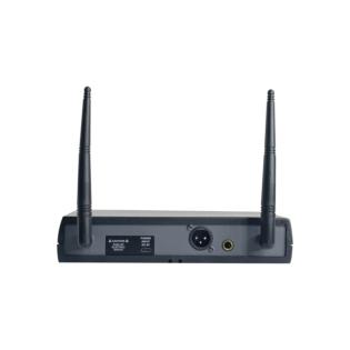 Radiomicrofono compatto ed efficiente comprensivo di un trasmettitore palmare. Dispone di 48 canali per poter operare in ogni condizione. La portata è di circa 30mt con ottima resa acustica sia sul parlato che nel canto. La base ricevente possiede sia una presa di tipo XLR bilanciata sia una presa mixata di tipo 6,3mm.