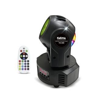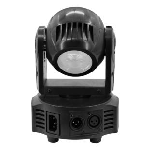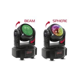 Mini testa mobile con doppio effetto luce (sfera + spot). Ruotando proietta i 2 effetti in ogni direzione generando uno spettacolo di luci di grande effetto. E' presente una staffa per il posizionamento su tralicci. Il display frontale consente di impostare la modalità di funzionamento desiderata (Auto, manual, sound, DMX). La luminosità è assicurata dai 2 led da 10W inseriti all'interno. Ideale per l'impiego in feste private, abitazioni, ristoranti e piccoli locali.