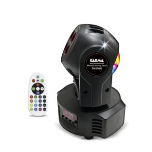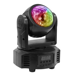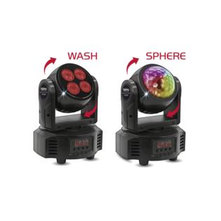 Mini testa mobile con doppio effetto luce (effetto sfera + Wash). Ruotando proietta i 2 effetti in ogni direzione generando uno spettacolo di luci di grande impatto. E' presente una staffa per il posizionamento su tralicci. Il display frontale consente di impostare la modalità di funzionamento desiderata (auto, manual, sound, DMX). La luminosità è assicurata da 1 led da 10W (effetto ball) e da 4 led da 6W (effetto wash). Ideale per l'impiego in feste private, ristoranti e piccoli locali.
