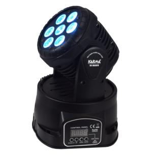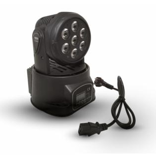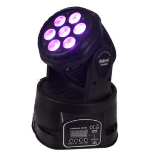 Piccola ma potente testa mobile in grado di generare fasci luminosi particolarmente intensi grazie ai suoi 7 led da 10W. Ogni led può illuminarsi in 4 colori (RGBW) permettendo di ottenere ogni tipo di tonalità desiderata. E’ compatibile con impianti DMX -512 ma può operare anche in modalità automatica o a tempo di musica.