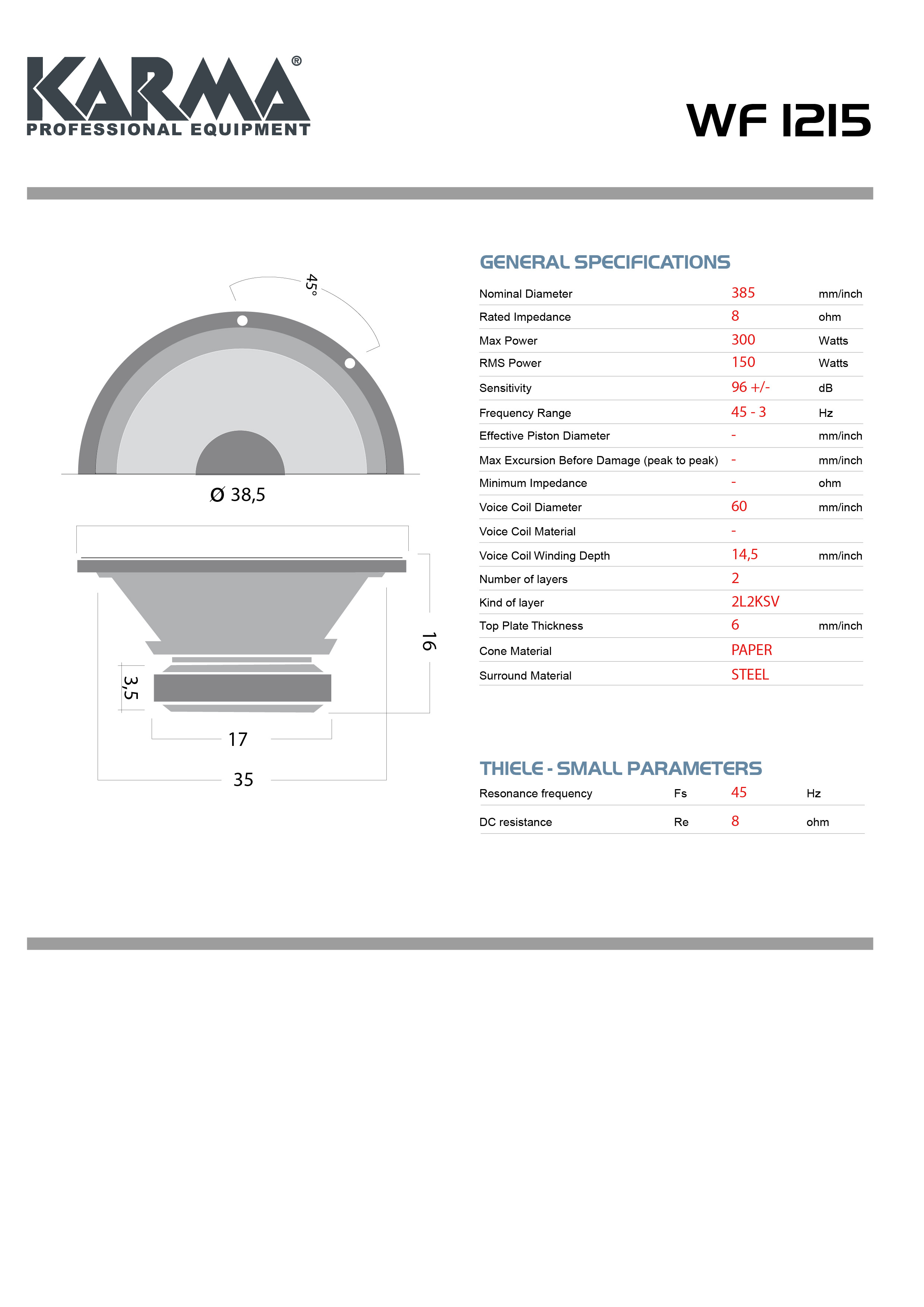 Woofer con diametro di 15" operante a 8 Ohm in grado di fornire una potenza massima di 300W. Ideato per l'installazione in diffusori o impianti audio di qualsiasi genere. Ottima resa acustica.